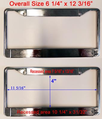 Blank license plate frame with recessed areas at the top and bottom ready to accept decal, domed decal, or other insert. Made from zinc alloy with chrome plating. Overall size is approximately 6 1/4" x 12 3/16". See images for internal dimensions.